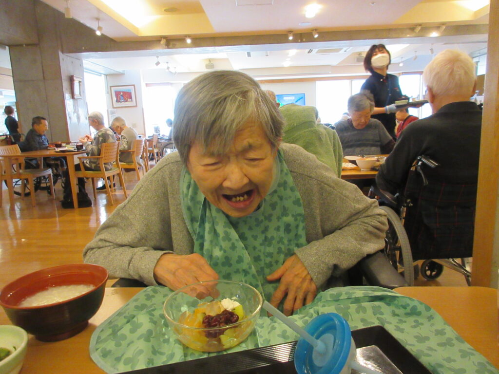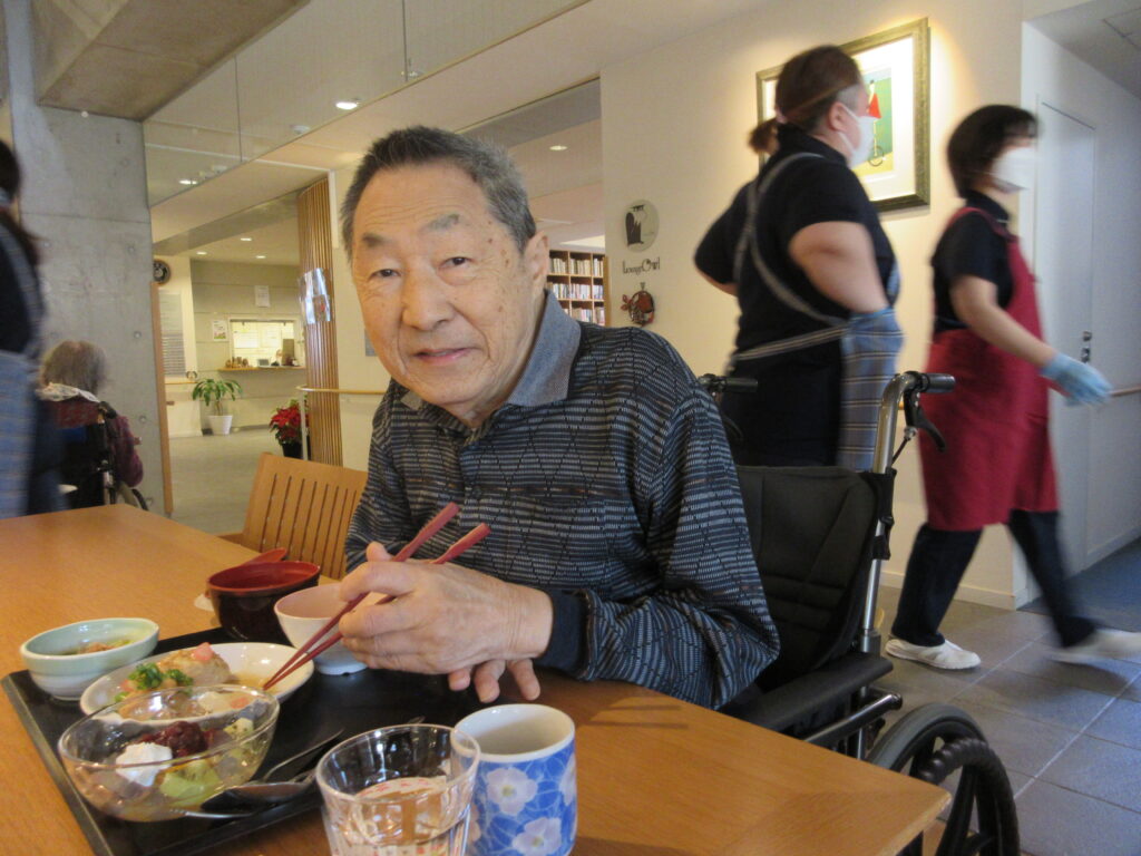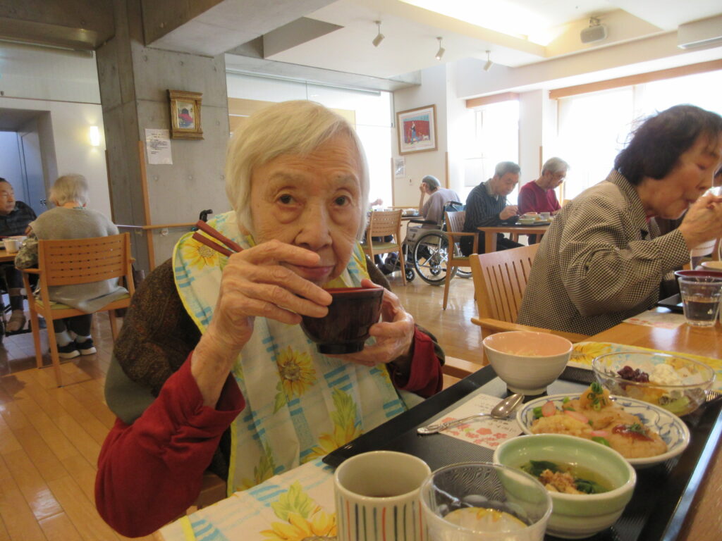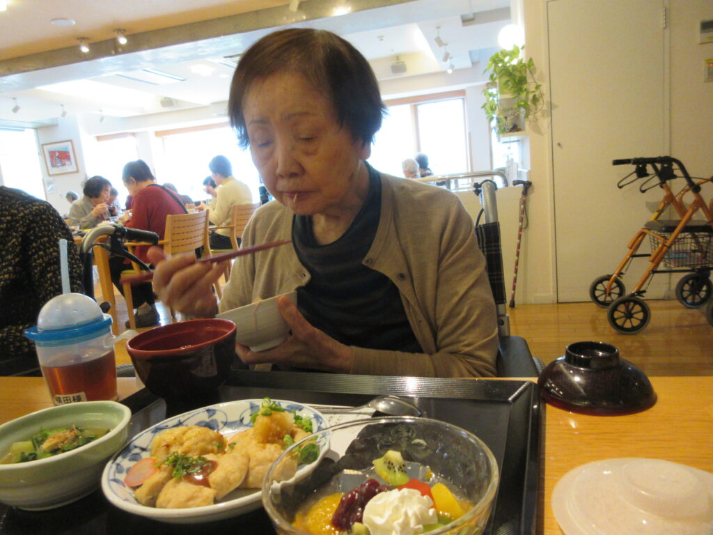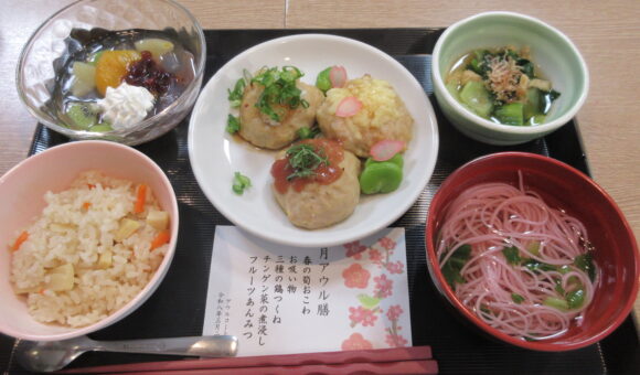 春の筍おこわ・お吸い物・三種の鶏つくね・チンゲン菜の煮浸し・フルーツあんみつ